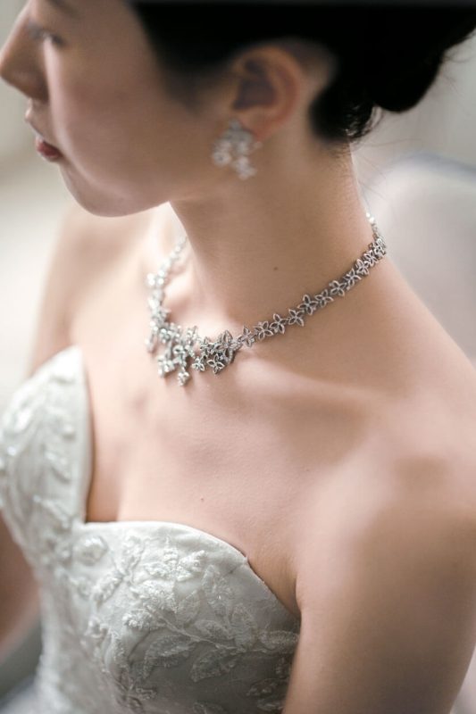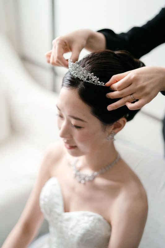 ドレスに合うティアラをいくつか提案してもらい、結婚式を挙げた「フォーシーズンズホテル京都」の緑豊かなチャペルと披露宴会場の雰囲気に合うデザインだったこと、試着したときに一番似合うと感じたことが決め手に。