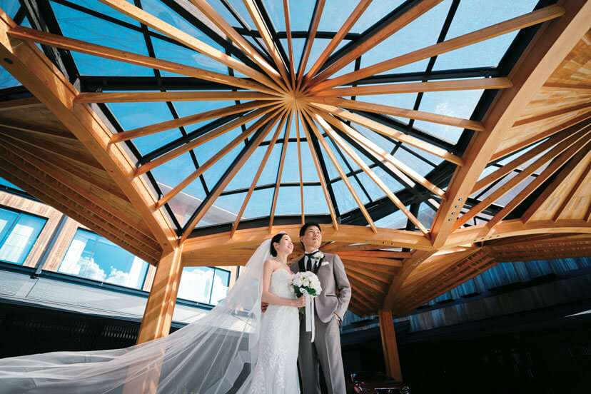 和傘をモチーフとした印象的なデザインのエントランスをはじめ、洗練された館内や京都らしい日本庭園などお気に入りのスポットで撮影。澄んだ空気と青空の下、ダイヤモンドの輝きと共に、この上ない美しい写真を未来に。