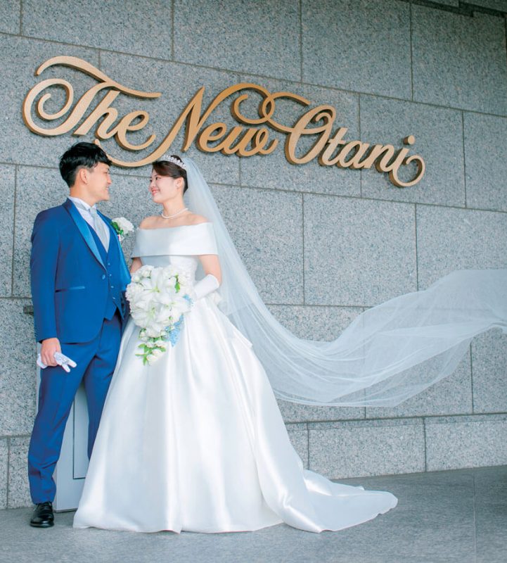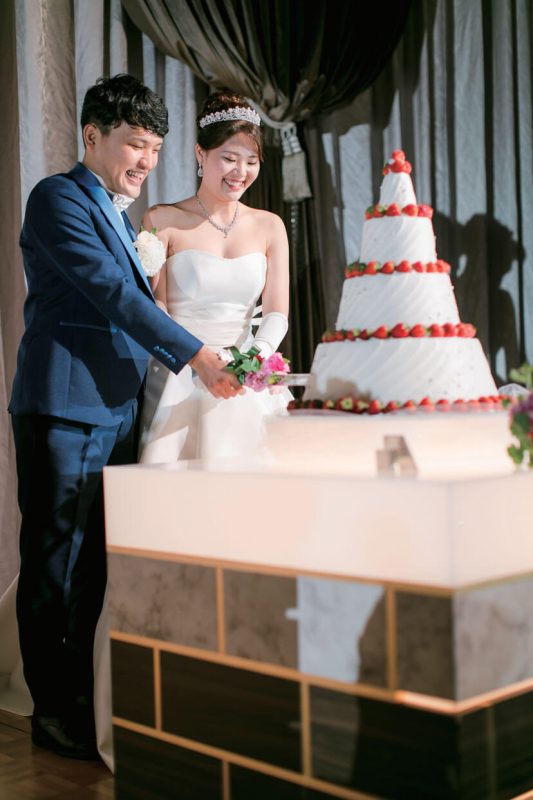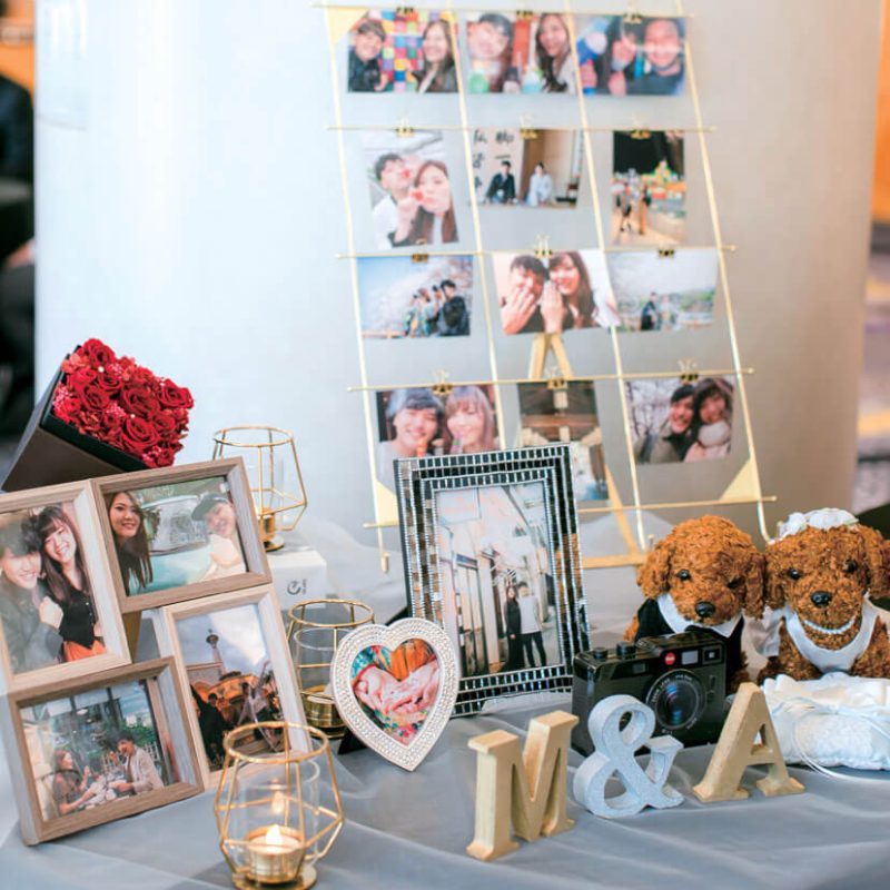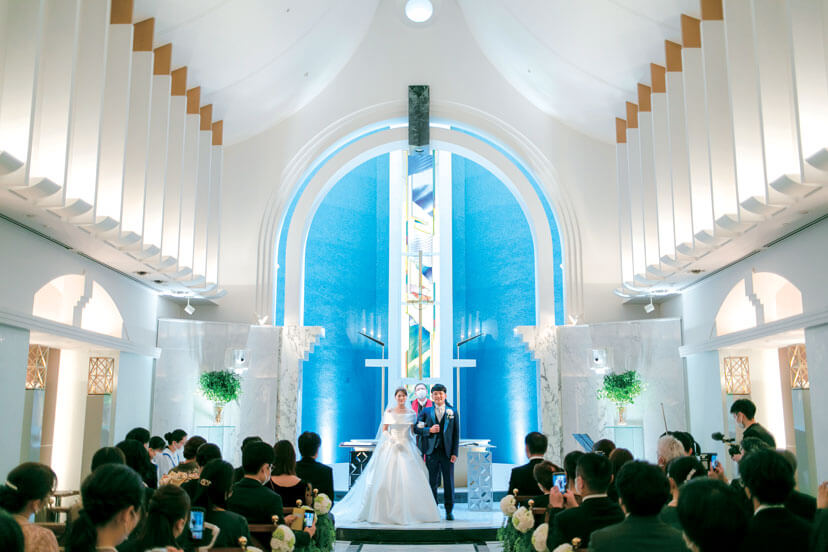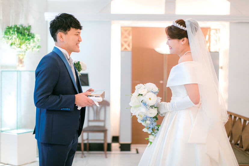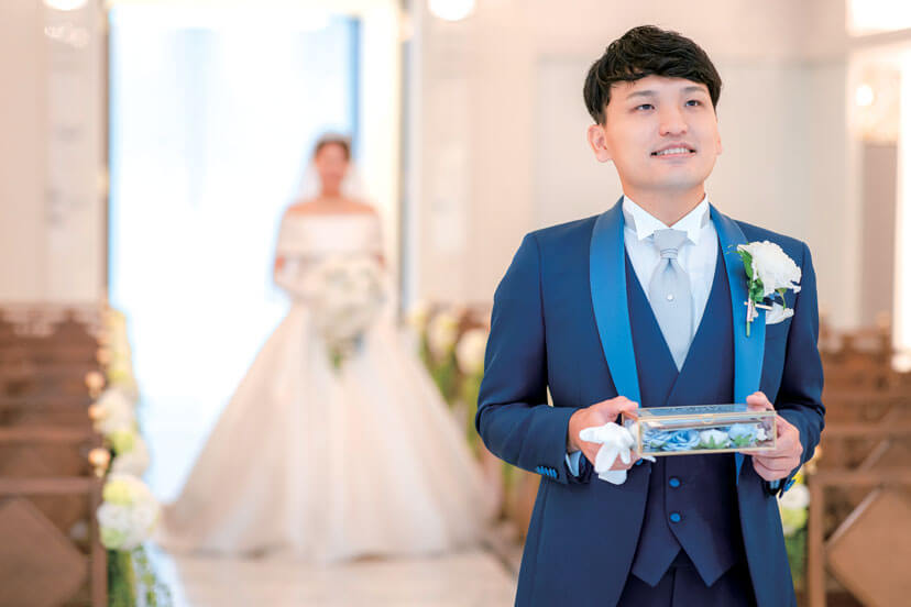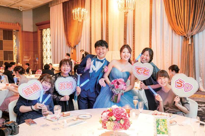 花嫁の幸せを願うサムシングブルー。ふたりの結婚式は「大切なゲストの幸せを願って」という想いを込めて、青をテーマカラーにした。衣裳はもちろん、リングピローやシューズ、引き出物も青に。さらに青いペンライトの光で会場を染めるという、ゲスト参加型の演出も用意。「光がキレイだった」「ライブみたいで楽しかった」と、思っていた以上に盛り上がった。またゲスト期待の料理は、接触機会を減らすことを重視した「4皿のコース」に。品数が少ないことが心配だったが、試食会で驚くほどのボリュームがあり、これならゲストにも満足してもらえると選んだ。当日は、サーブされる料理をゆったりと堪能き、年配の親族や女性ゲストから「落ち着いて食事ができた」「最後まで美味しかった」と絶賛の声も。ほかにも思い出の写真を並べた、チェキ風のエスコートフォトも、ゲスト同士の会話が弾むアイテムとなった。楽し過ぎてあっという間だったという夢のような一日。今も写真や映像を見返すたびに、ゲストの素敵な笑顔や祝福の言葉が蘇る。