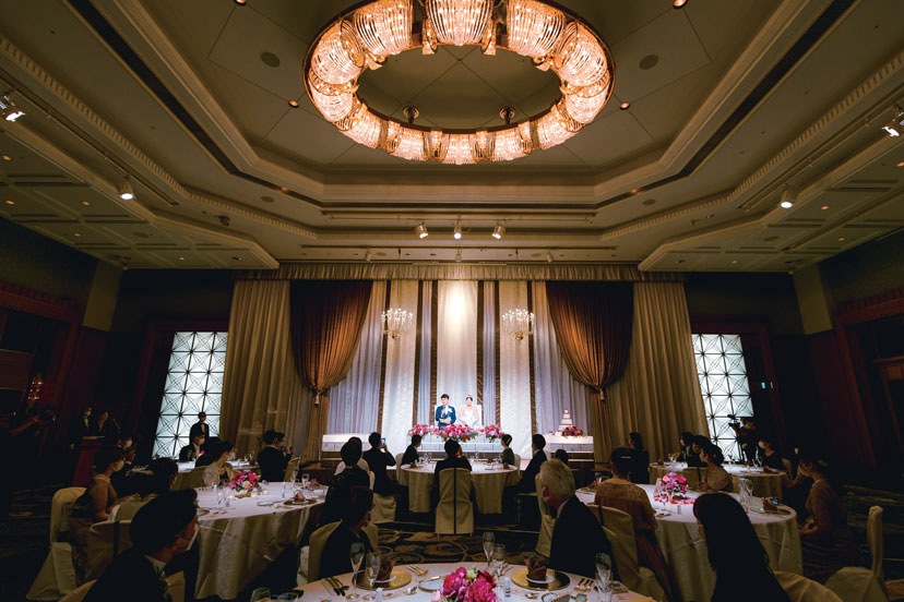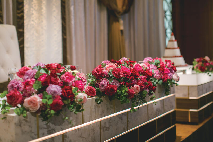 ブラウン×シャンパンゴールドの会場を、青の補色に近い深紅からピンクの装花でコーディネート。ラグジュアリーななかにも可愛らしさのある空間に。