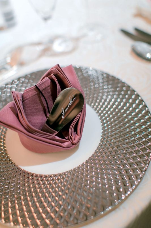 式後も使ってもらえるように、女性には携帯サイズのミラー、男性は靴ベラにゲストの名前を入れて席札に。
