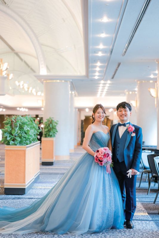 幼い頃から憧れていたチュールたっぷりのプリンセスラインドレス。ブルーで統一した衣装に、ピンクのブーケとブートニアを合わせて甘さもプラス。