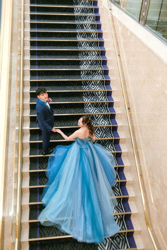 大階段に映える、ブルーグラデーションのカラードレス。グリッターが左半分に配され、見る角度によって表情が変わるのもお気に入りのポイント。