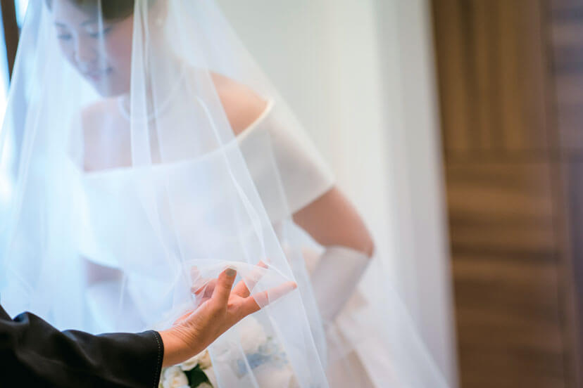 新婦の表情が隠れてしまわないように、ベールは滑らかな透け感のイタリアンソフトチュールにこだわった。