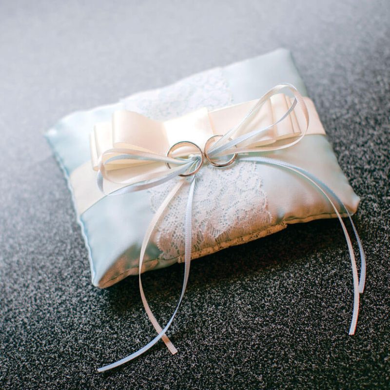 新婦手作りのリングピローもテーマカラーを取り入れて。