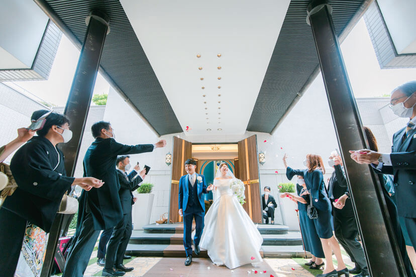 退場では感動で涙する妹や友人も、フラワーシャワーでは穏やかな笑顔で何度も「おめでとう」と祝福。ブーケトスで見事キャッチしたゲストへコスメセットをプレゼント。