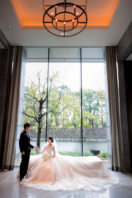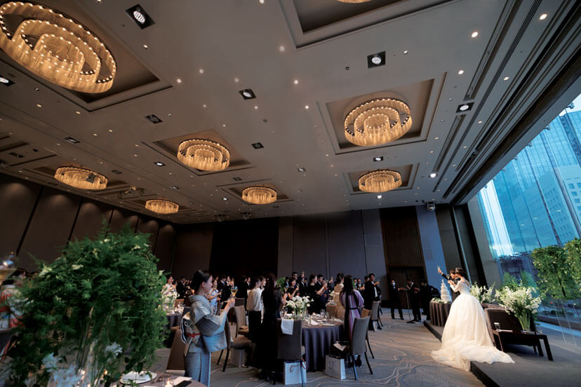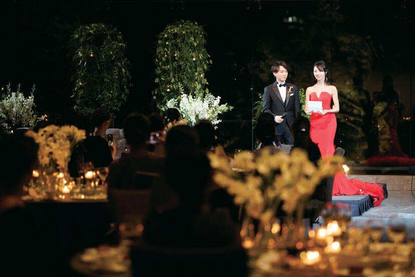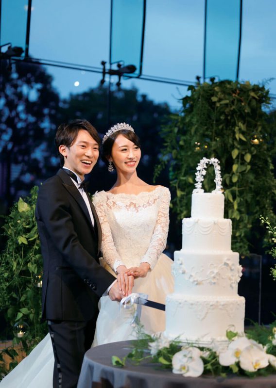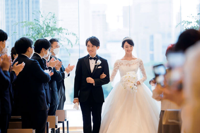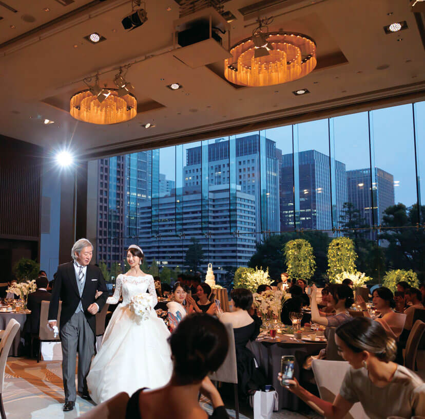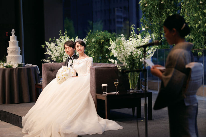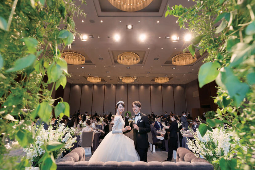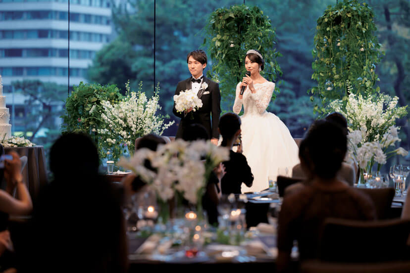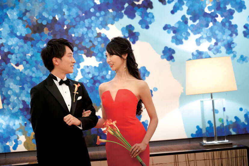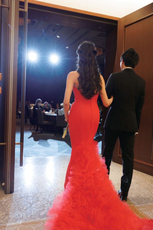 都会のなかでも自然に囲まれ、上質なおもてなしを味わえる「パレスホテル東京」は、東京駅に近いアクセスの良さも魅力のひとつ。遠方からのゲストはもちろん、年配の方も安心して来られるよう配慮して式場を決定した。装花はシンプルかつ清涼感のある雰囲気に。夕方からの披露宴だったため、キャンドルも多用し、幻想的な会場を創り上げた。ドレスは、上品でいて華やかな「ハツコエンドウ」をセレクト。お色直しでは映画のヒロインをイメージし、赤のマーメイドドレスにチェンジした。料理は季節の食材を使った、秋のコースをチョイス。メイン料理は会場でサーブする演出もあり、ゲストから好評だった。家族や親戚、友人や上司・同僚への感謝をテーマに、楽しんでもらえるようゲストファーストで創り上げていった。ゆったり過ごしてもらいたいと、余興は行わず洗練された雰囲気に。「007」の曲に合わせての再入場は、まるで映画のワンシーンのようだったとゲストからは大好評。ゲスト同士も会話が弾み、コロナ禍でも楽しんでもらえる式となった。