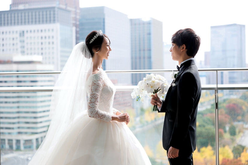 皇居外苑を見渡すテラスでのファーストミート。新婦から新郎へ感謝の気持ちを綴った手紙のサプライズも。