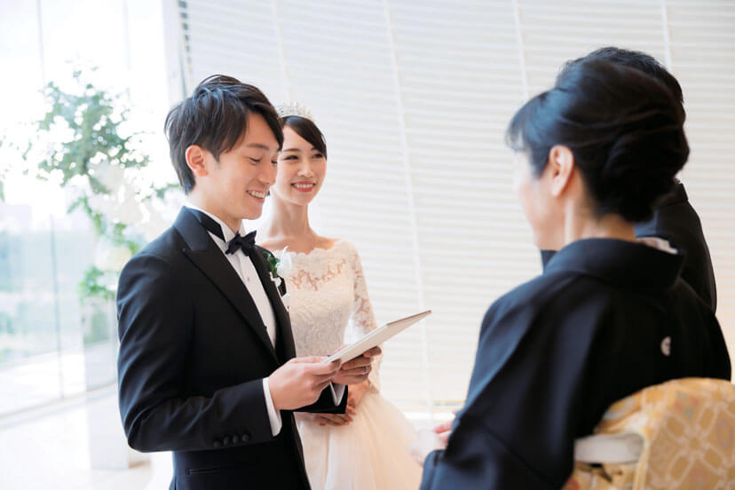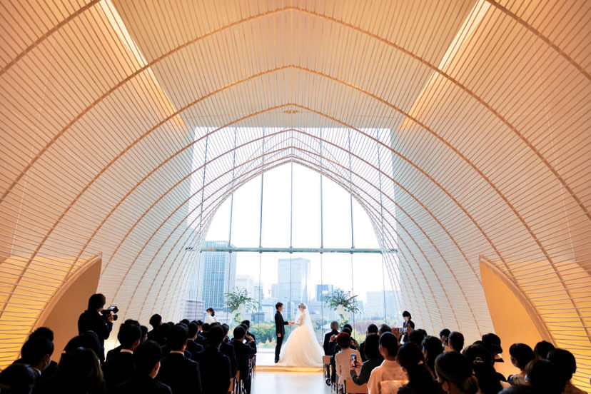 ハープとオルガンの生演奏が響くなか、ふたりの言葉で愛を誓った人前式。