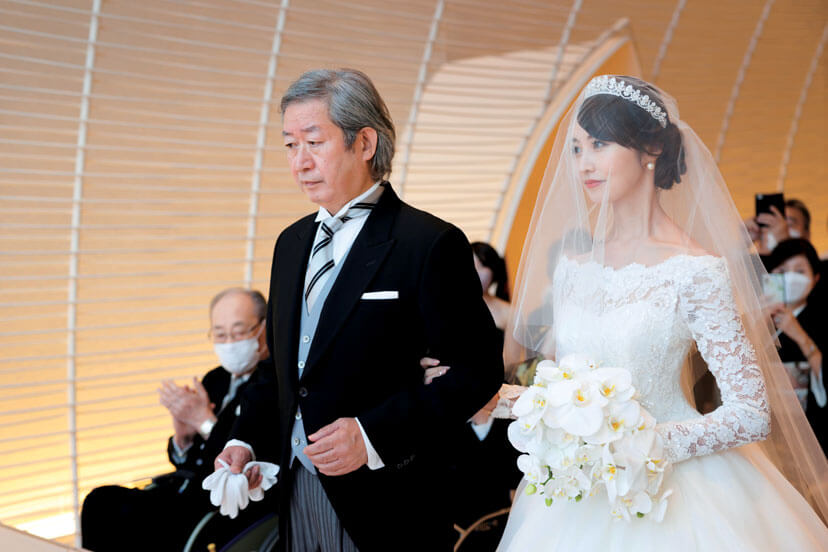 自慢の娘に見えるよう選んだドレスをまとい、父とゆっくりとバージンロードを進む。