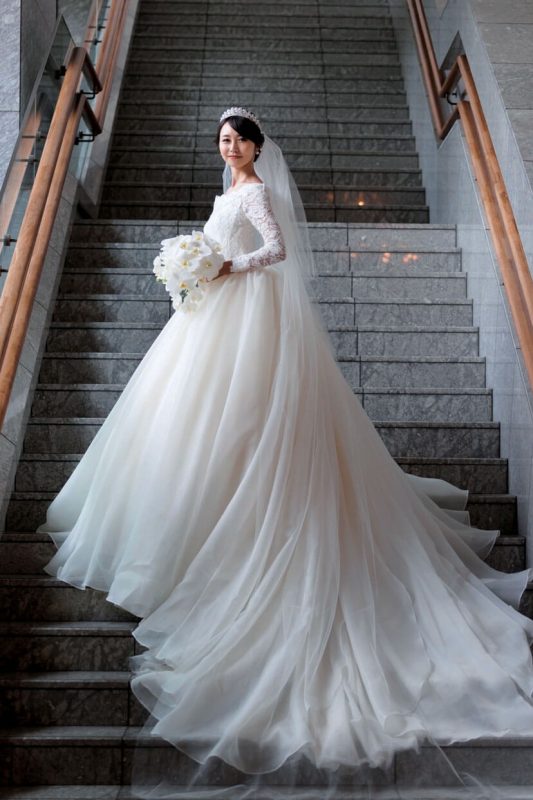 【フォトシューティング】ロングベールをまとって、憧れの階段ショット。