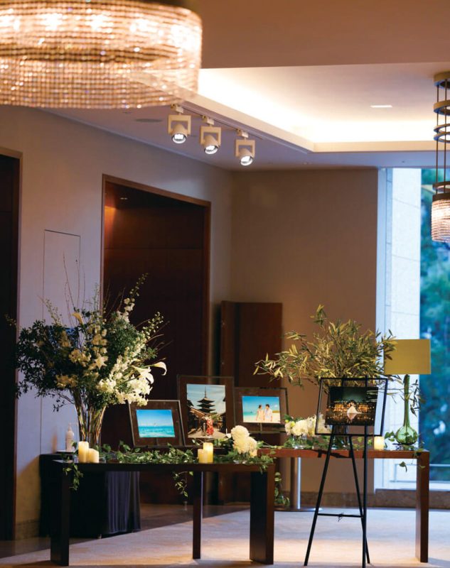 【装花コーディネート】ウエルカムスペースから会場と同じ装花でコーディネートして統一感を演出。