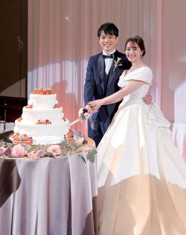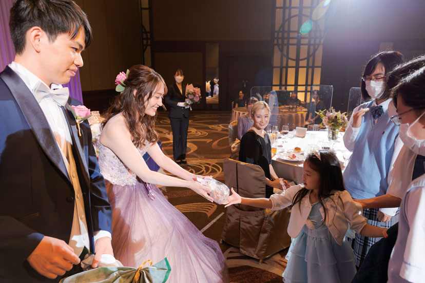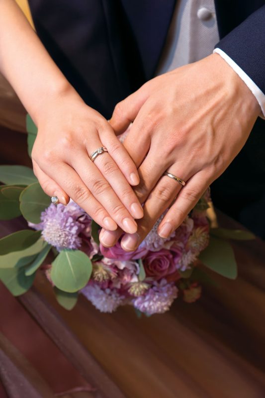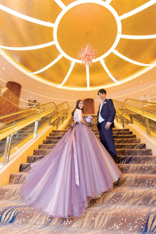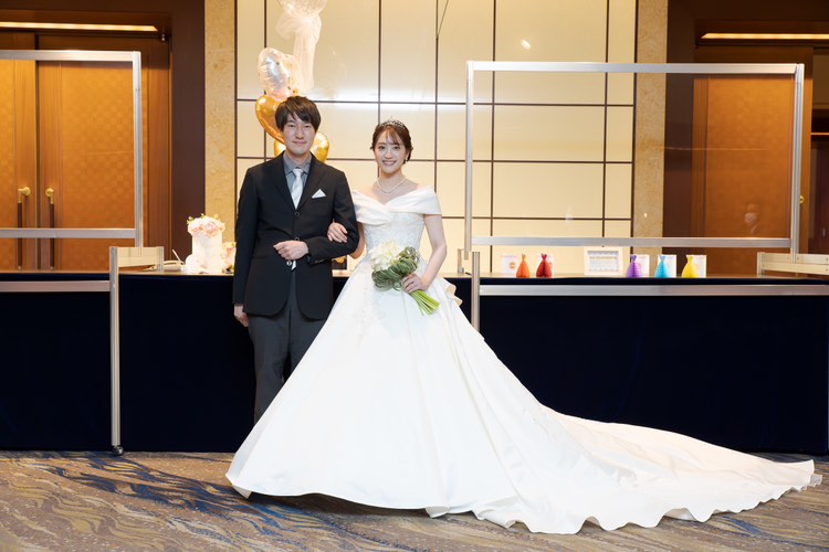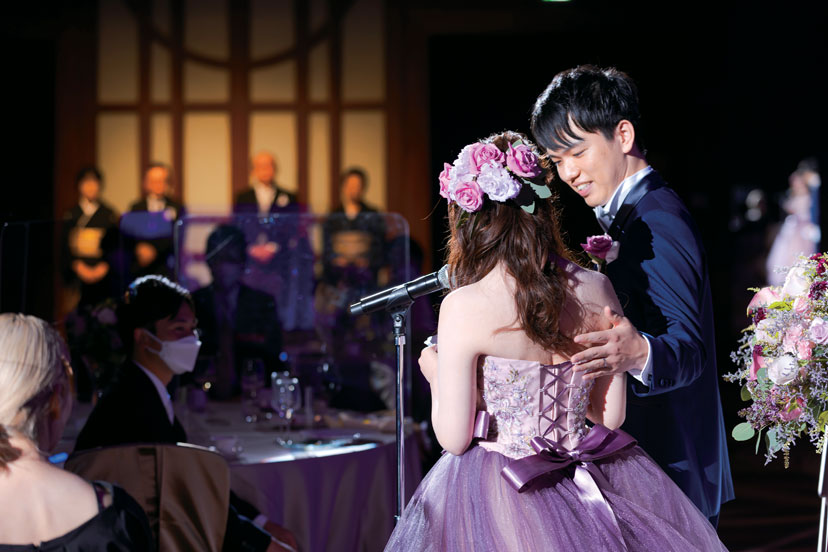 交際開始から間もなく、新郎転勤のタイミングで入籍したが、コロナのため結婚式は2年後に。時間を経た分、式への期待が膨らみ、一人ひとりに感謝を伝えたい気持ちがより深くなったふたり。スタッフのサポートを受けて、入念に準備を進めた。当日、花嫁が一目見たときから「ここで式を挙げたい」と惹かれた「チャペル ブリリアント」にて挙式。生演奏が響くなか、愛を誓う瞬間にはふたりとゲストが一体となったような感動に包まれた。挙式後、階段から降りてきたふたりをフラワーシャワーが祝福。憧れの演出だったので、喜びもいっぱいに。パーティ会場では、ピンクと薄紫をメインにした装花でゲストをお出迎え。余興はせず、美味しい料理を味わいながらゆったり寛いでもらえるよう配慮。お色直しドレスのカラー当てクイズやサプライズプレゼント、写真撮影など楽しく会話できる演出を盛り込んだ。式の後、「自分が結婚式を挙げるときに参考にしたいくらい素敵だった」など、たくさんの喜びの声が届き、ふたりの想い通りのウエディングが実現した。