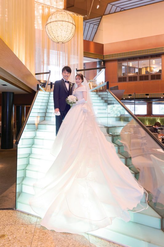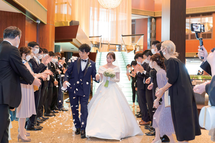 挙式後は、アトリウムロビーの階段を降りたところでフラワーシャワーの祝福を浴びて、ふたりもゲストも、晴れやかな笑顔。