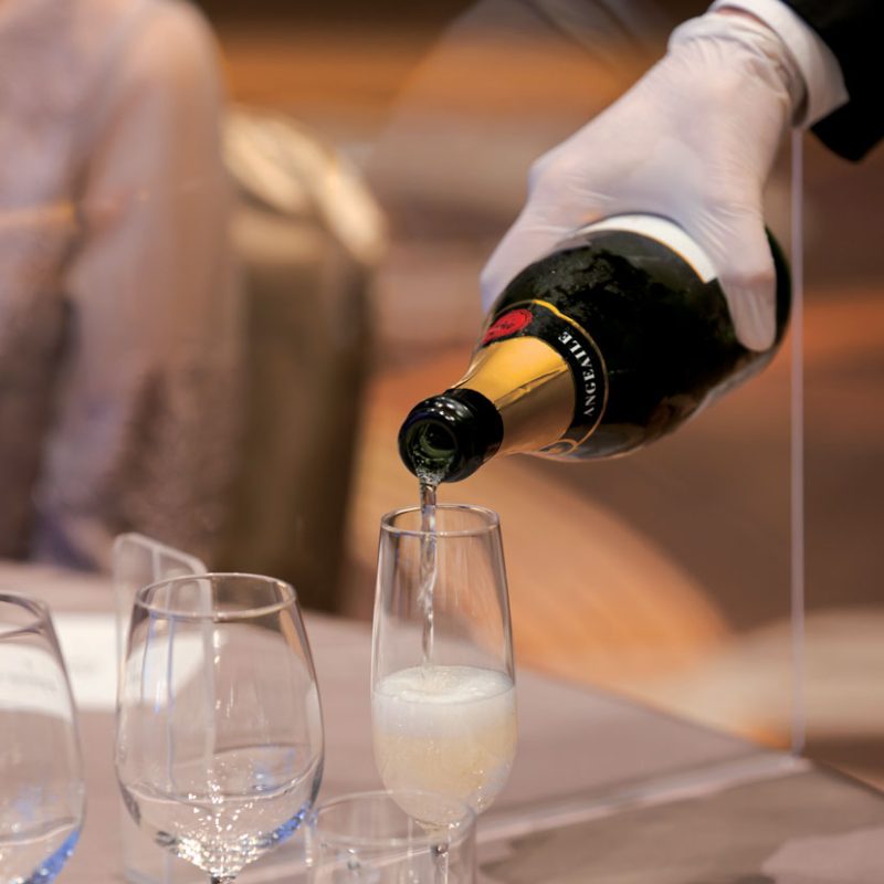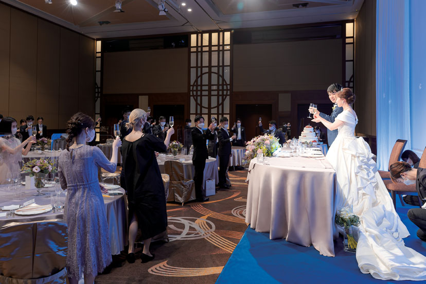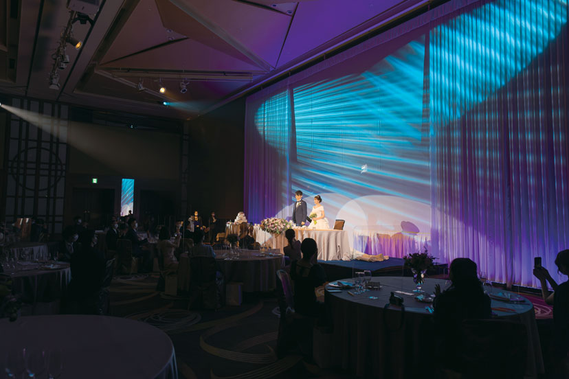 高い天井、広々とした開放的な空間を生かして光の演出でドラマティックに祝宴スタート。