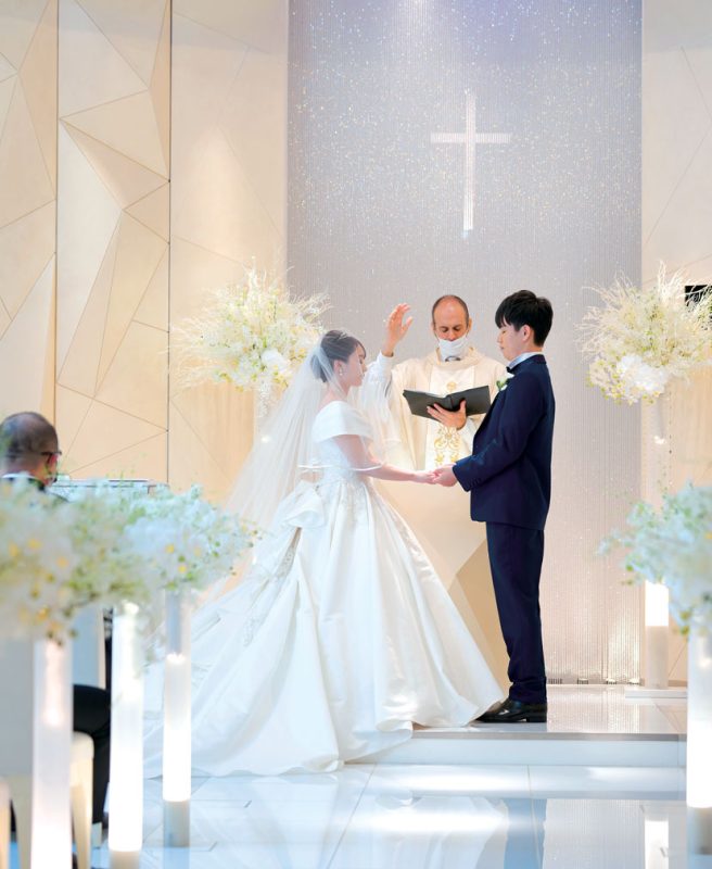 花嫁が一目惚れした「チャペル ブリリアント」は、ゲストに見守られるようなラウンドフォルムの空間も魅力。牧師先生の温かな言葉に導かれて愛を誓った。