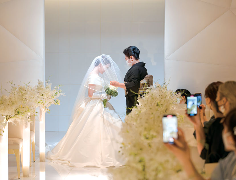 母からのベールダウンの演出では泣かないようにと思っていたものの、姿を見た瞬間に涙が溢れてきた花嫁。「ありがとう」と伝えると、母も目を潤ませていた。