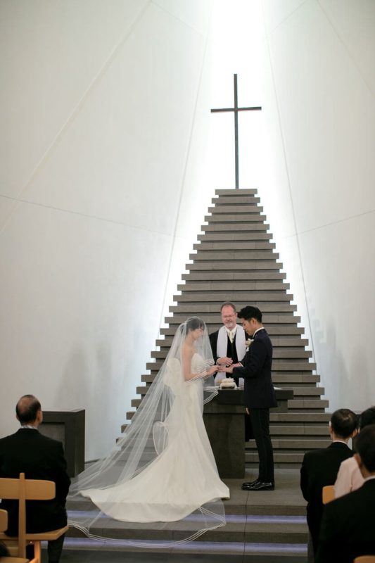 結婚式は、海外ドラマのようなキラキラした時間をゲストに過ごして欲しいと、会場装飾や料理、ドレスにもこだわり準備をスタートした。東京オリンピックの開会式でMISIAが着ていた「トモ コイズミ」のドレスは、ボランティアで参加していた新婦にとって思い出深いブランド。まるでファッションショーのランウェイを歩くような、インパクトあるドレスを思い切って選んだ。また、ゲストと一緒に記念に残るものを作りたいとウエディングキャンバスを用意。新婦の好きなピンクは愛、新郎の好きなネイビーは忍耐、白は感謝、ブラウンはお金と4色の絵の具から「結婚生活に大切だと思うこと」をゲストに選んでもらい、キャンバスに1本の線を描くもの。ゲスト同士、「その色選ぶんだね!」など会話も生まれ、楽しいイベントとなった。挙式後は「一番オシャレな式だった」「演出やドレスが新鮮」など、準備を頑張って良かったと思えるうれしい感想がたくさん届いたという。素敵な思い出が詰まったこのホテルへ、結婚記念日にまた泊まりに来ようと話している。