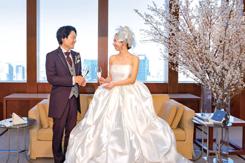 新婦はチュールのトーク帽にチェンジ。ソファに桜の木を飾ったシンプルスタイリッシュな高砂席 。