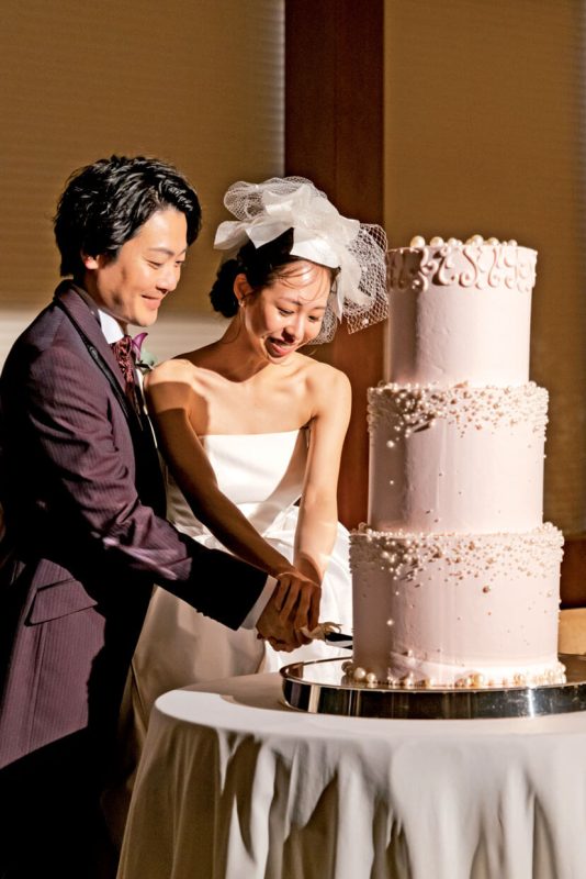 桜に合わせたダスティ―ピンクに大好きなパールを散りばめたウエディングケーキ 。
