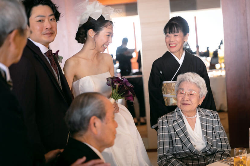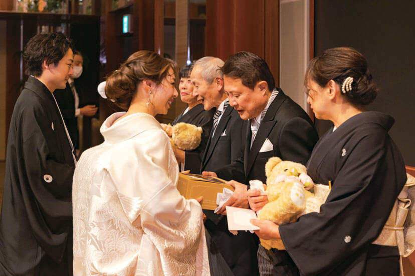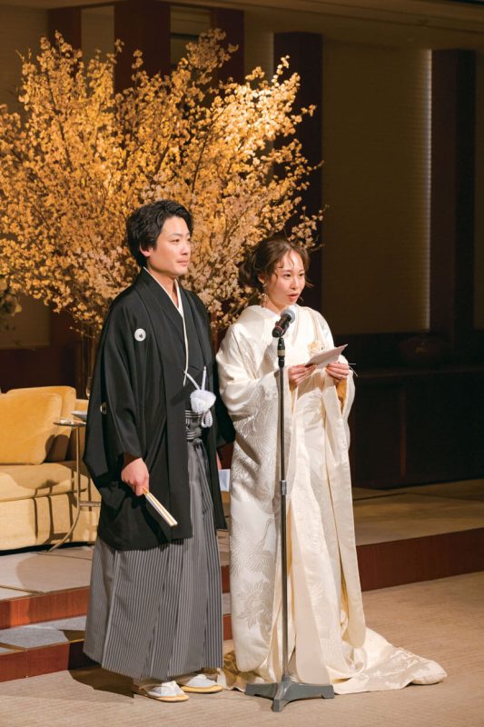洋装から白無垢と紋服姿にお色直しして、披露宴後半に和の趣をプラス。