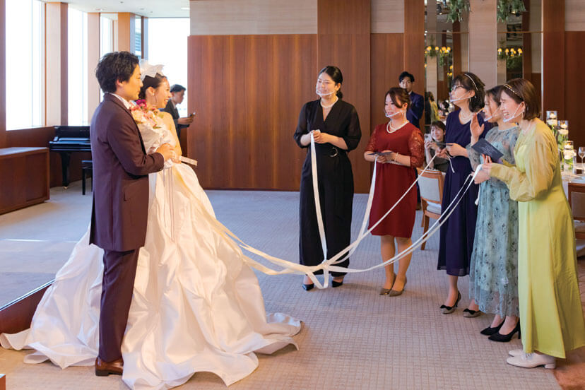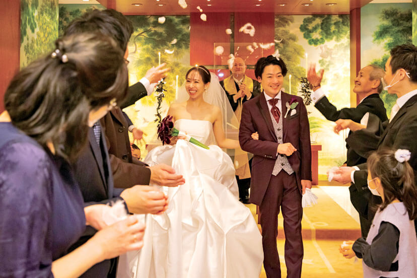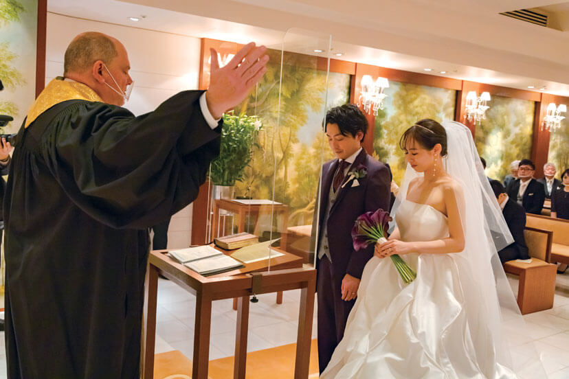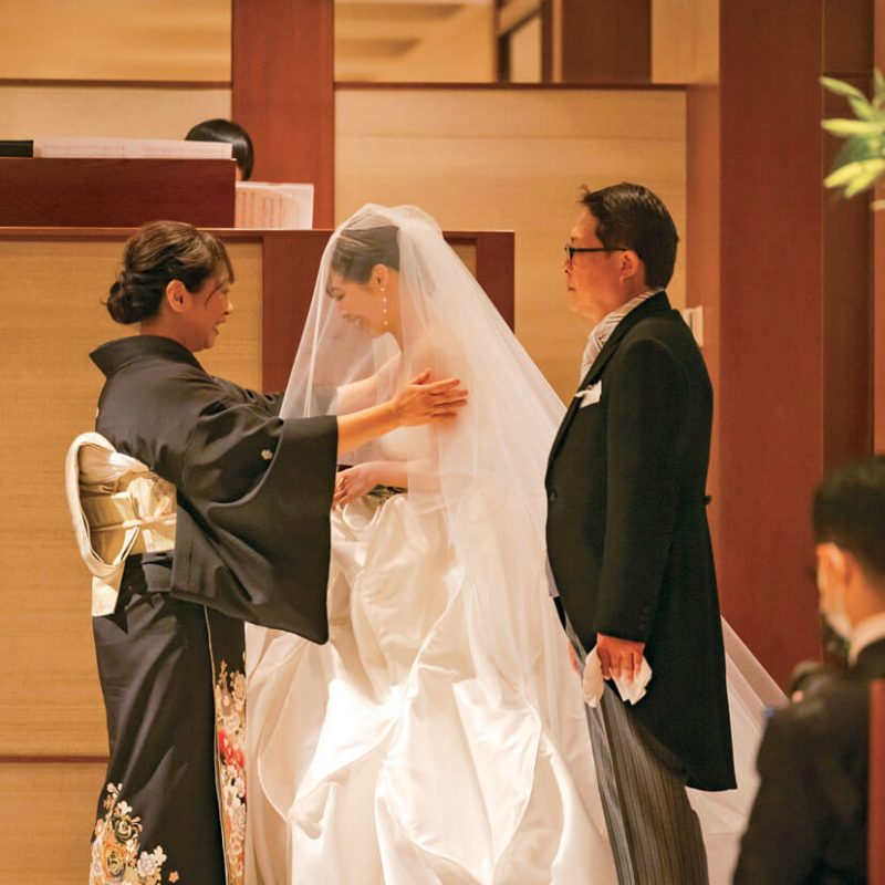 これまでの思い出が蘇り感謝の気持ちがこみ上げたという新婦母からのベールダウンに続き、父と共に一歩一歩、かみしめるようにバージンロードを進んだ。コロナ禍での配慮として参列者にはマウスシールドを配布。久しぶりに会うゲストの笑顔をはっきり見ることができたのもうれしかった。