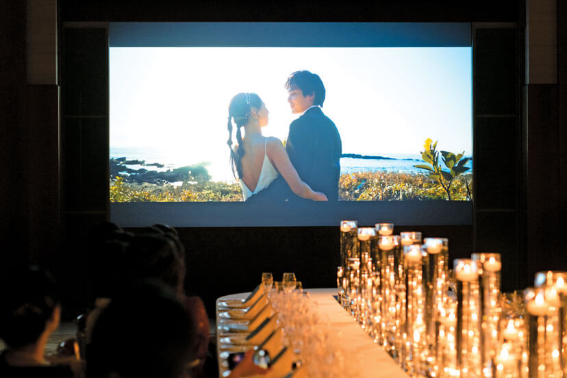 オープニングムービーは城ケ島での寒中ロケ撮影に挑んだ力作。プロフィールムービーは新婦の自作で、想い出の写真を使い家族やゲストが感涙するほどの作品に。エンドロールは出会いの空港や