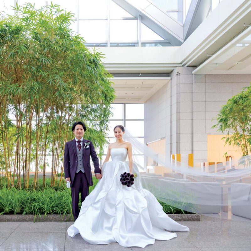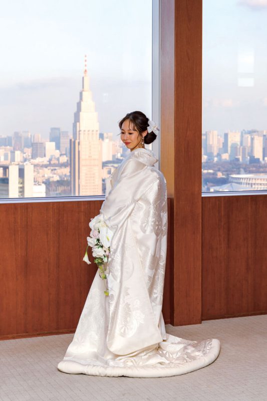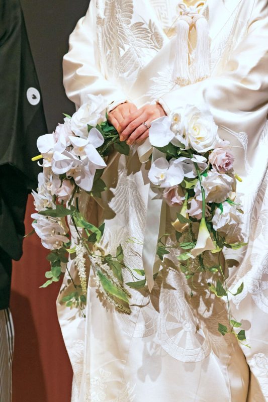 縁起物の鶴モチーフの打掛は織の美しさで選んだ逸品。洋髪に胡蝶蘭、バレリーナブーケを持ち、和洋掛け合わせの理想のスタイリングを叶えた。