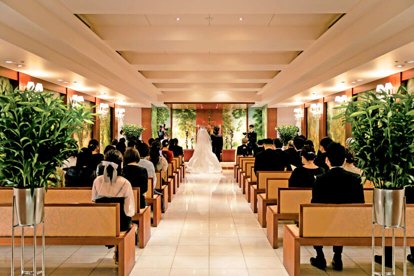 緑の壁画が神秘的なチャペル。聖歌隊の歌声や生演奏が厳かな雰囲気に。新婦は「自分の人生の中に“結婚式”という時間を設けて本当に良かった」と実感したという。