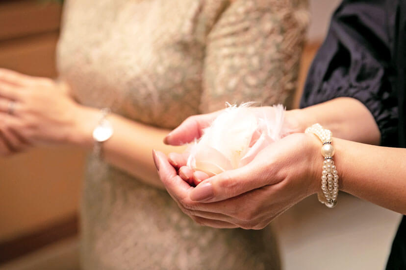 退場シーンは、ゲストからの祝福の笑顔に見送られて。フラワーシャワーは、生花に時差でゆっくり降り注ぐフェザーをミックス。