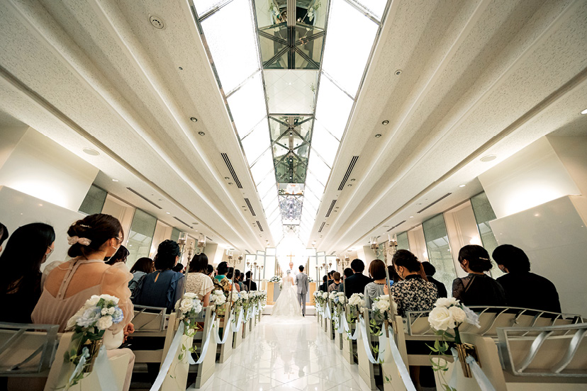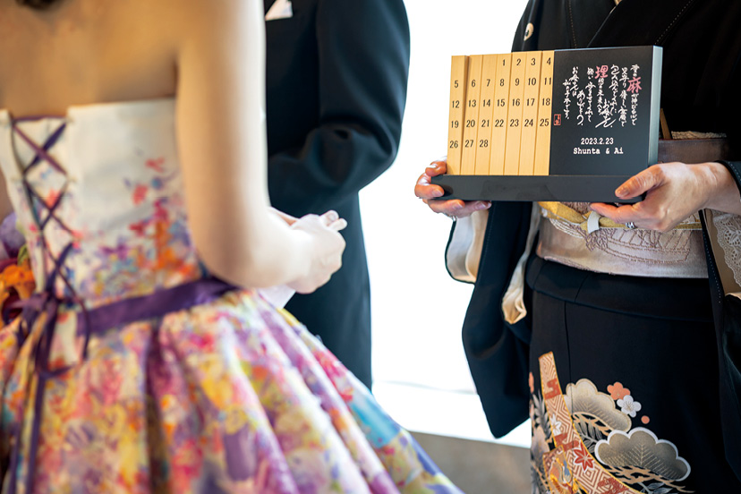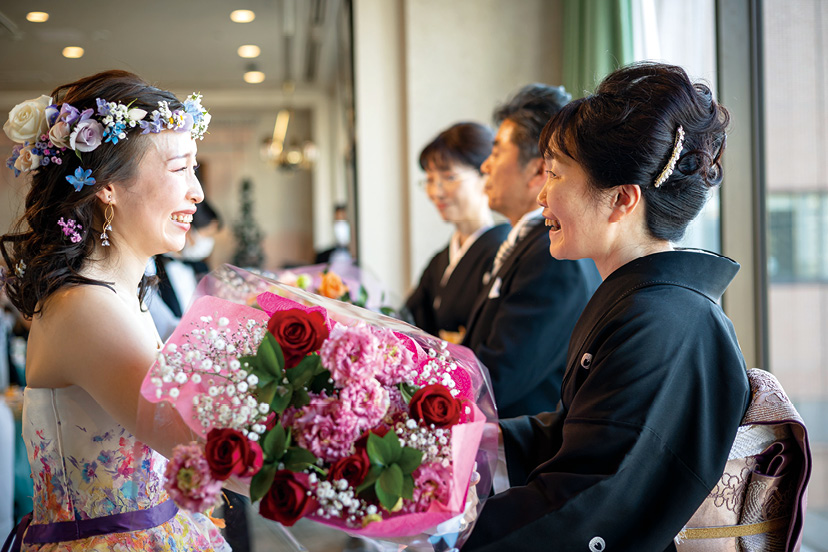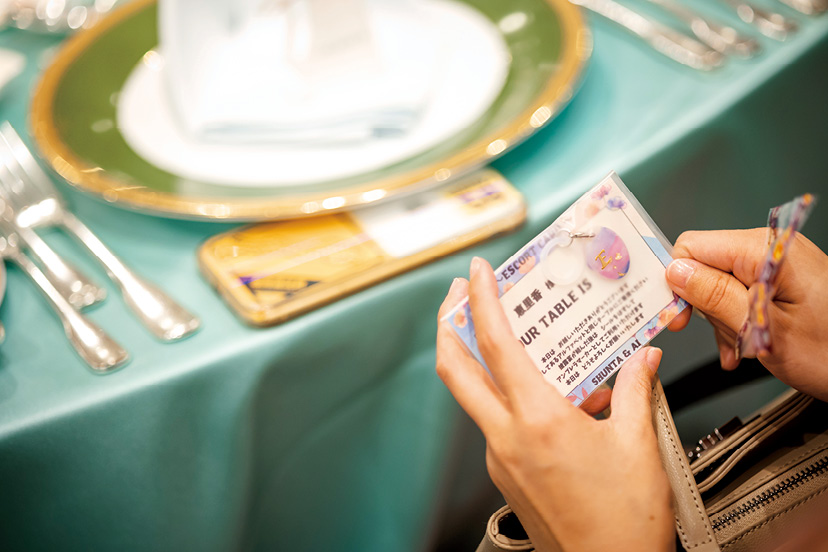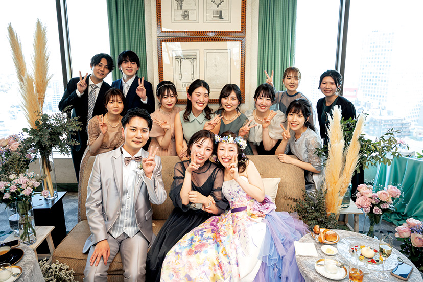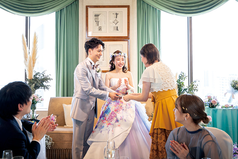 挙式は、純白に輝くチャペルを舞台に、深い愛情を注いでくれたという新婦の祖父母がセレモニーを担うなど、心温まるものとなった。披露宴は、ゲストと同じ目線でフランクに会話ができるようにソファ席に。おもてなしの料理は、ゲストの食の好みや、使われているお皿が珍しく魅力的だったことから、2つのコースを組み合わせた和洋折衷料理をセレクト。メインまでの3品は和フランスのコースを選んだオリジナルのメニュー構成にして、祝宴のテーブルを彩った。「出会った場所がそれぞれ違う大切な人たちが、同じ日、同じ場所に集まってくれて、改めてたくさんの人たちに支えられてきたと実感することができました。エンドロールムービーを何度も見返しています」と語ってくれた。(Hotel Wedding 52号掲載)