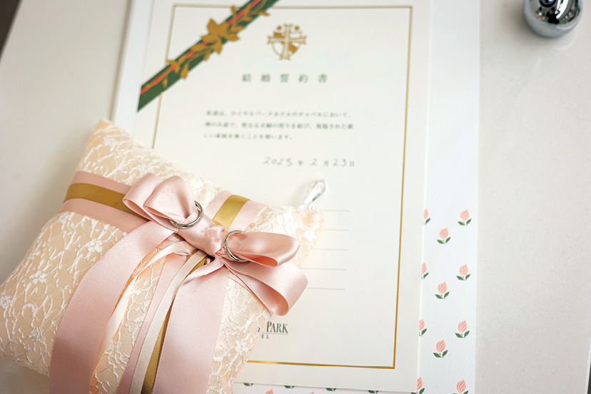 リングピローは、新婦母と祖母の手作り。