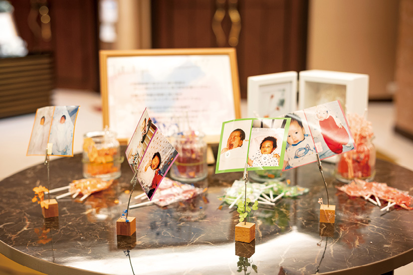 ウエルカムスペースに、新郎新婦の幼少期の写真の組み合わせと同じ色の飴を選ぶゲームを仕掛けて。ゲスト参加型にするため、抽選ではなくじゃんけんで賞品を贈った。