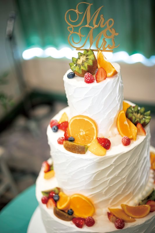 フレッシュフルーツを飾った鮮やかなウエディングケーキ。