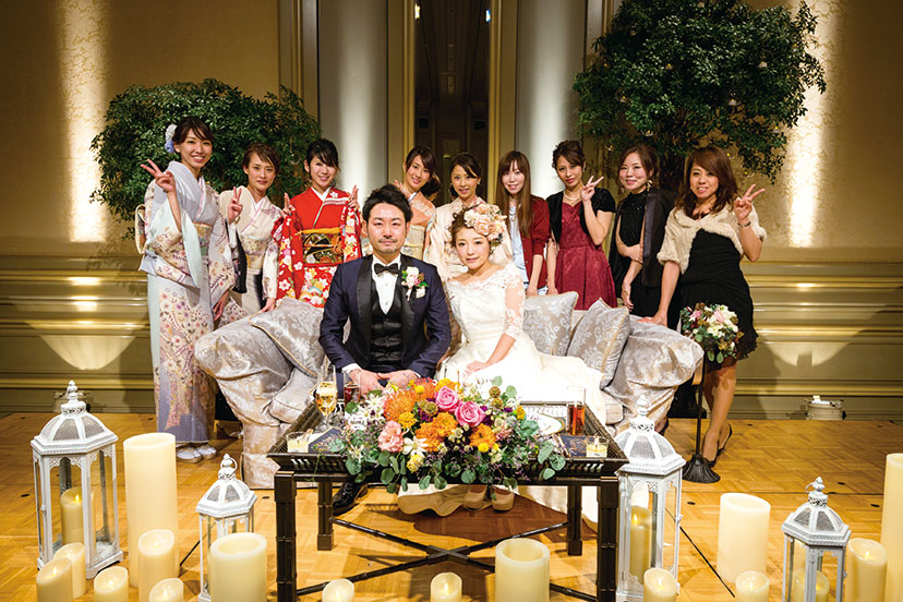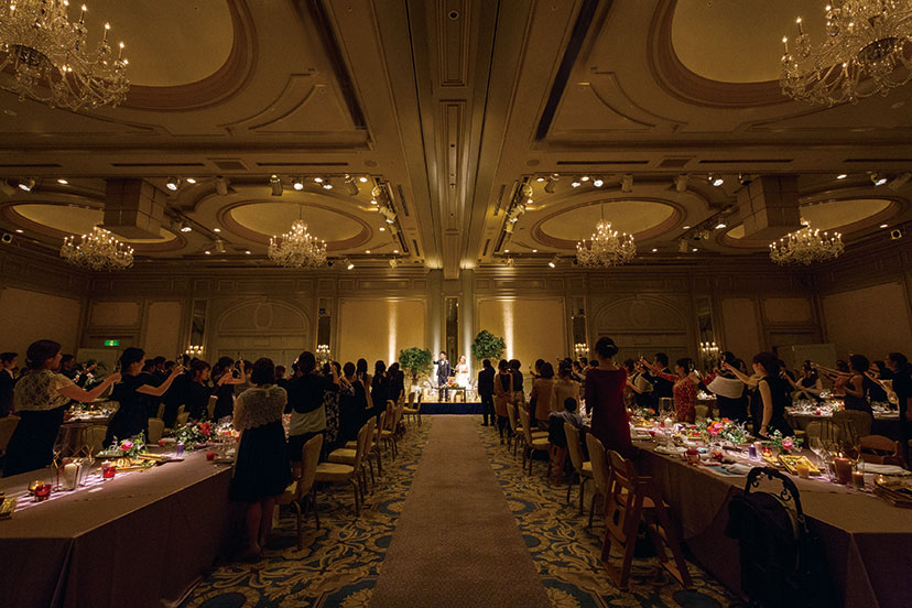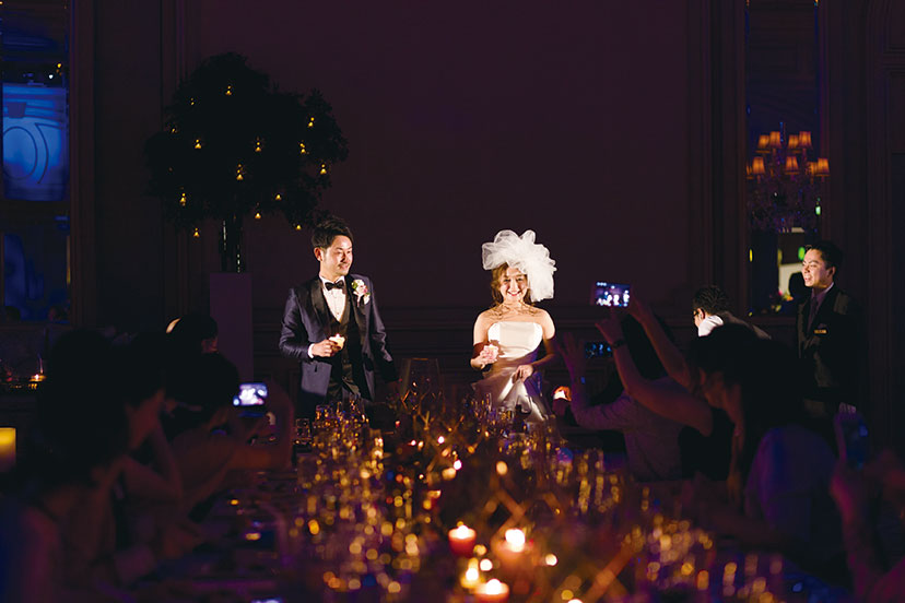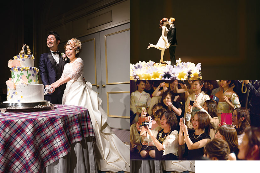 緑溢れる庭園での家族との和やかな時間の後は、シャンデリアが煌く「ボールルーム」でのパーティ。ハワイでの挙式の映像が流れた後、心地よいサウンドが響く中、ふたりが入場。大ぶりの花をヘアにあしらった花嫁の美しさが際立った。まゆさんがデザインした、お花畑に蝶々が舞い降りたようなケーキは最高の出来映えに。鴨肉やキノコなど旬の食材を使ったシェフおまかせ料理は大好評。後半はキャンドルリレーからスタート。ふたりからゲストへと灯されたキャンドルが会場を一層ドラマティックに彩り、終始笑いと寛き感のあるパーティとなった。