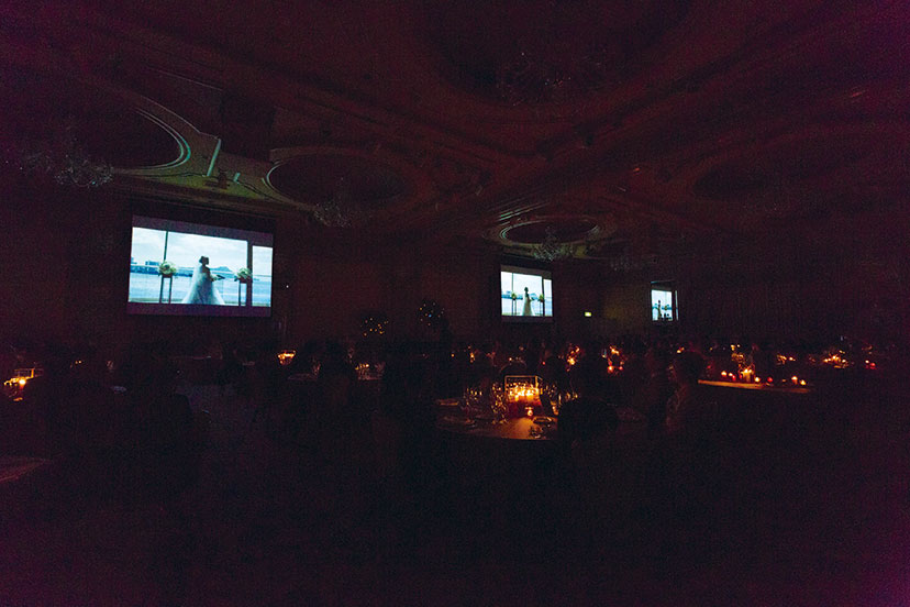 ハワイ挙式の映像上映の後、ムーディなBGM でふたりは入場