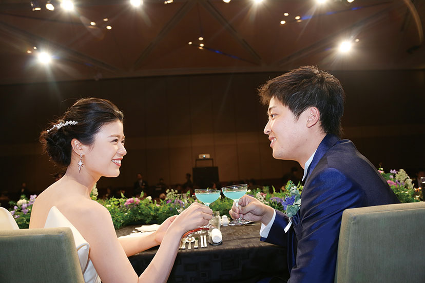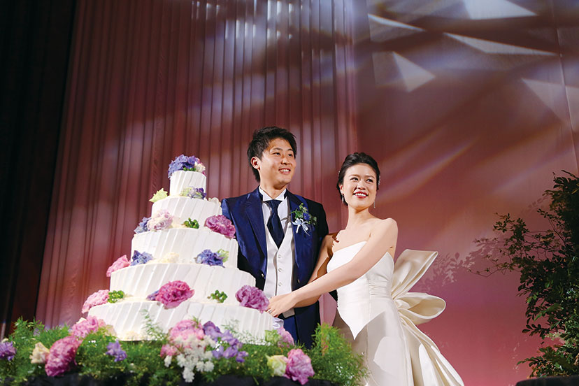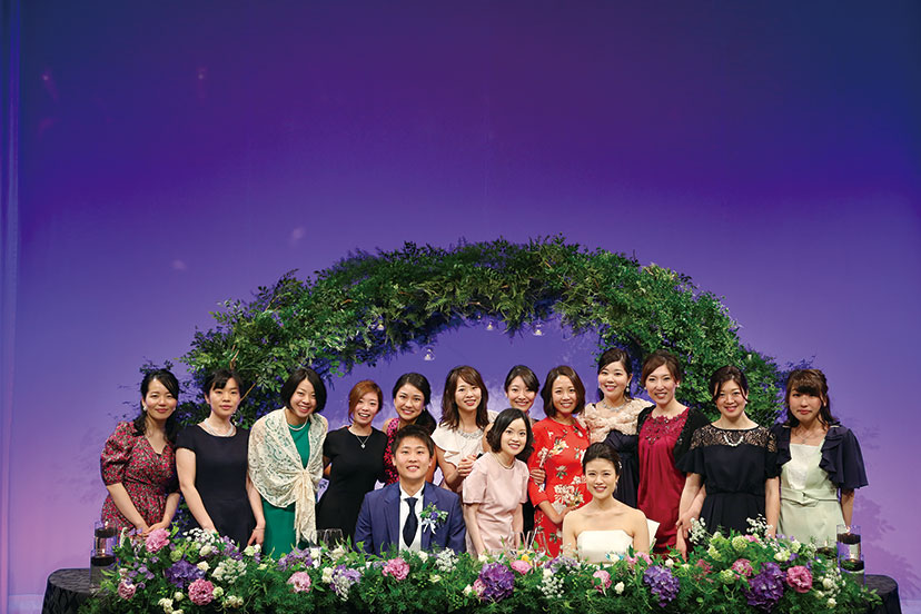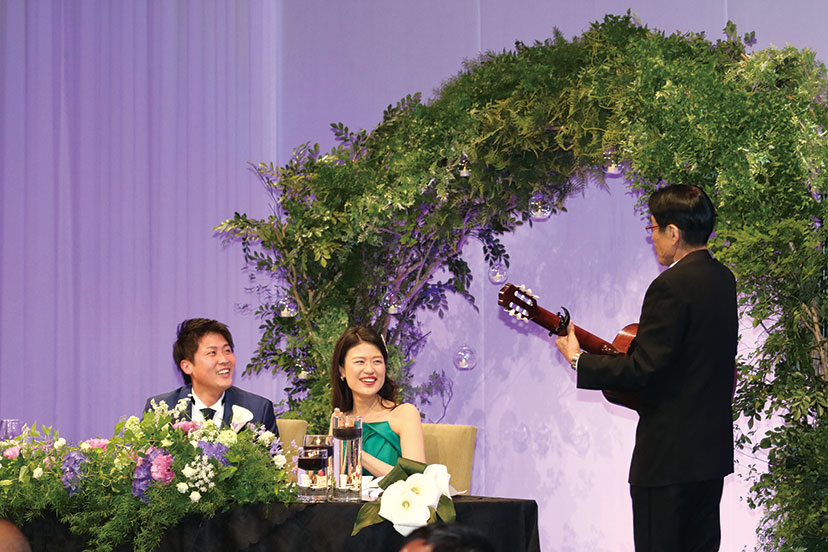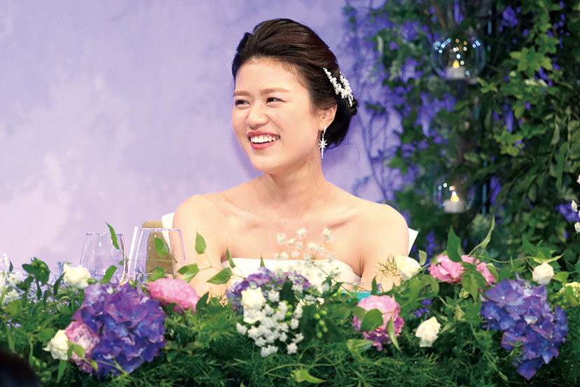 「担当してくれたプランナーさんに感謝の気持ちでいっぱい」と振り返るふたり。「大人ナチュラル」な空間をテーマに細部までこだわりを実現。セレモニーは、ふたりの人柄を感じさせる、笑顔溢れるアットホームなものに。披露宴では、「ネットや雑誌をたくさん見てフローリストさんと相談しながら作り上げました」というグリーンをふんだんに取り入れたコーディネート。紫やピンクの花をアクセントにしたパーティ会場は「素敵だった」とゲストからも大好評。装花やウエディングドレスなど、とことんこだわることでふたりらしいウエディングを叶えた。