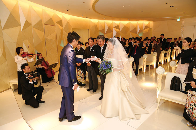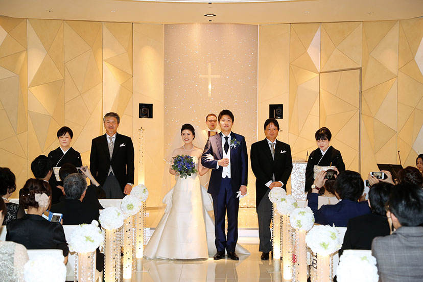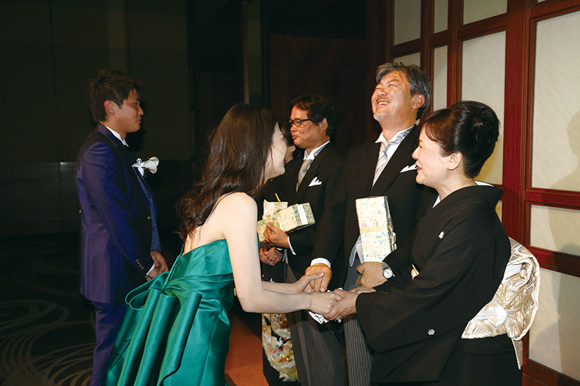 両家親と揃ってゲストへふたりが晴れて夫婦になったことを報告