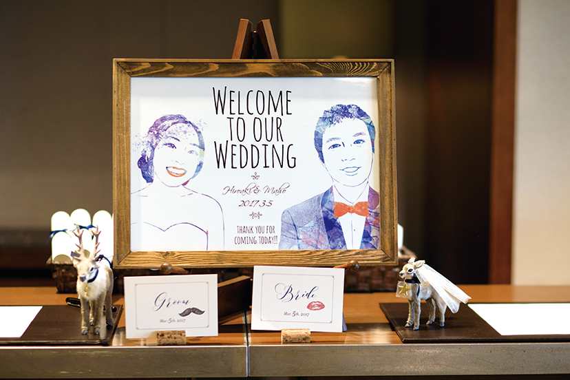 ふたりの似顔絵を描いたウエルカムボードを置いて、アットホームな雰囲気に