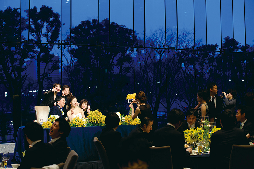 おしゃれな空間で、ゲストとの距離が近いアットホームなウエディングを演出したかったと語る新婦の真穂さん。都心にありながら緑豊かなロケーションと、開放感あふれるパーティ会場「葵西」に一目惚れ。テーマカラーは春を呼ぶミモザのイエローに決めて、会場をセンスフルにコーディネート。あえてお色直しを省き、ゲストとの語らいの時間を重視。ブライズメイド&アッシャーやフォトプロップスを取り入れ、海外ウエディングのようなパーティに。友人作の動画やサプライズの手紙など、感動シーンもあり、忘れられない1日となった