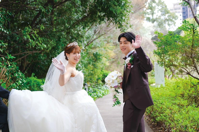 豪華なシャンデリアが煌めく「ザ・プリンス パークタワー東京」の「ボールルーム」に魅せられ、ゲストと楽しむ祝宴を準備した。挙式ではフラワーシャワーのあと、女性ゲストへブーケトス、男性ゲストにはブロッコリートスで笑顔がこぼれるひとときを。披露宴では光と音楽が織り成す華やかな入場、オリジナルデザインのケーキ、みんなの意表を突いたカラードレスなど、ゲストを驚かせる演出の数々に会場が盛り上がった。