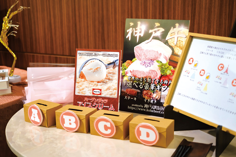 受付に用意したクイズに3問とも正解したゲストを発表。会場全体が一喜一憂し、正解者には松坂牛とハーゲンダッツをプレゼントした。