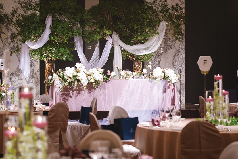 高さ10mの天井にバカラ社製のシャンデリアが眩めく「ボールルーム」。開放感溢れるエレガントな空間に、グリーンとキャンドルを配し、くすみ系の淡いピンクの花でやわらかさをプラスした。