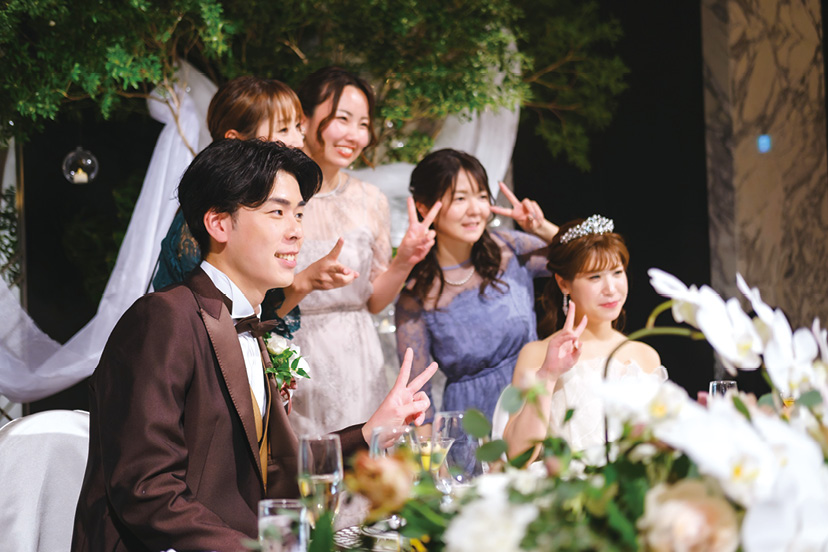 幼馴染から学生時代の友人、会社の上司まで、大好きな人たちが一堂に会する、一生に一度の幸せ過ぎる空間。ふたりで半年間、仕事の合間に準備してきた時間も、生涯忘れられない最高の思い出となった。(Hotel Wedding 53号掲載)