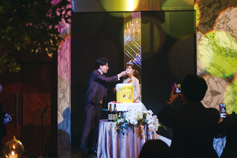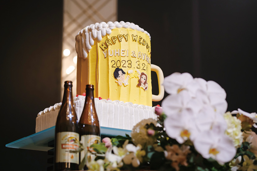 ケーキの打合せ中にインスタでビールをデザインしたウエディングケーキを見つけ、その場でプランナーがシェフに確認を取り実現。ケーキの中に仕込んだドライアイスから煙が出るという幻想的な演出も大いにゲストを沸かせた。