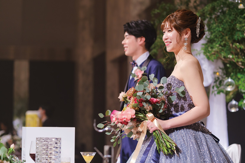 キラキラと輝くスカートが会場に負けない存在感のあるくすみブルーのドレス。ボルドー系のピンクブーケを添えて大人っぽく。