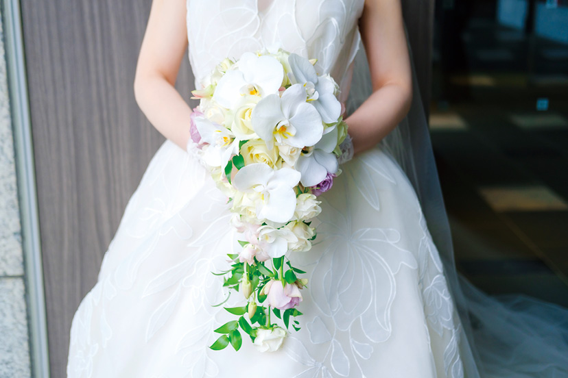 立体感のあるドレスの花モチーフに合わせて、たっぷりの胡蝶蘭をグリーンのあしらいで際立たせたキャスケード風ブーケ。
