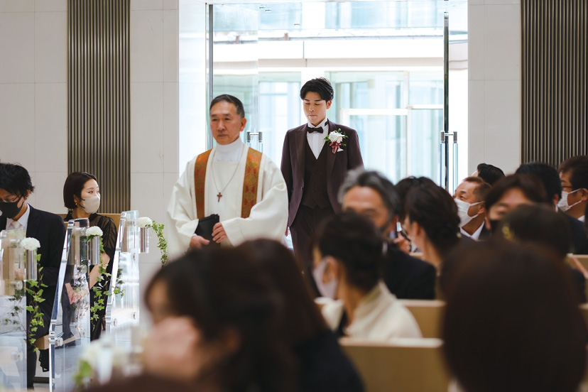 神聖な空気に包まれるチャペルへ牧師に導かれ入場する新郎。