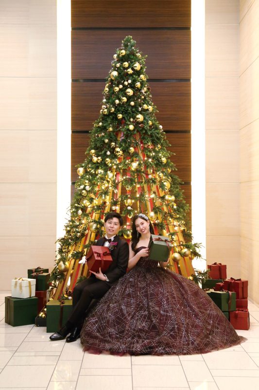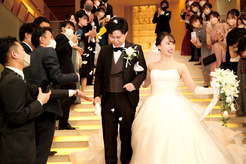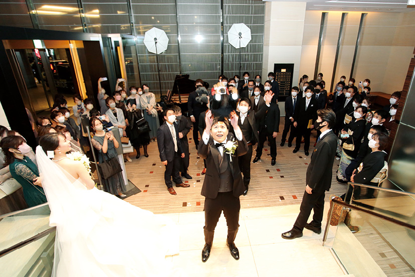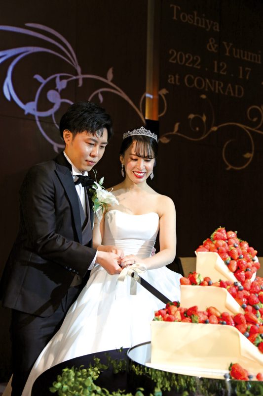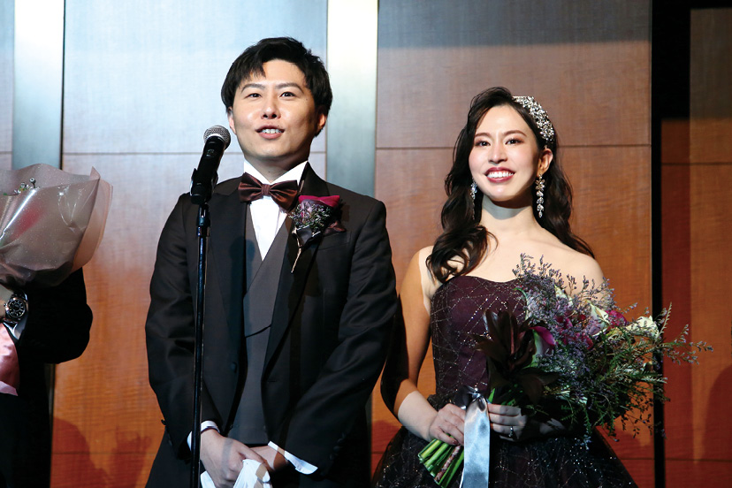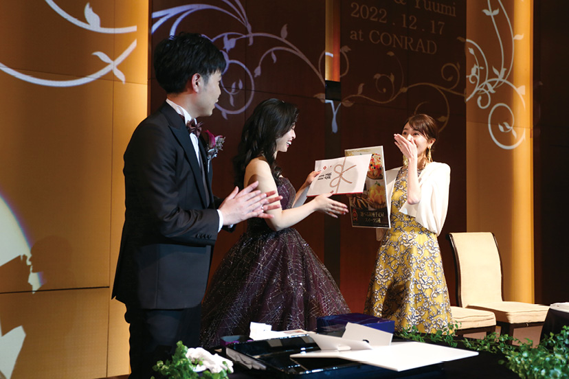 挙式は厳かな「ロイヤルウエディング」、披露宴は「大人のクリスマスフェス」をテーマに、そのギャップとワクワク感で盛り上がる演出を用意した。挙式後のブーケトスでは、誰がもらってもうれしいものをと、ハンドケアアイテムを入れたコスメブーケを新婦が手作り。男性には新郎の出身地にちなんでギフトカード付きのくまモンぬいぐるみトスを行った。