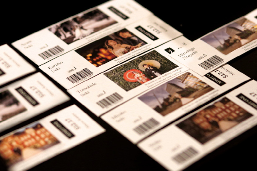 ライブチケット風のエスコートカード。ゲストの手元に残る半券は、一枚一枚異なる前撮り写真を印刷して、ゲスト同士が楽しめる工夫も。